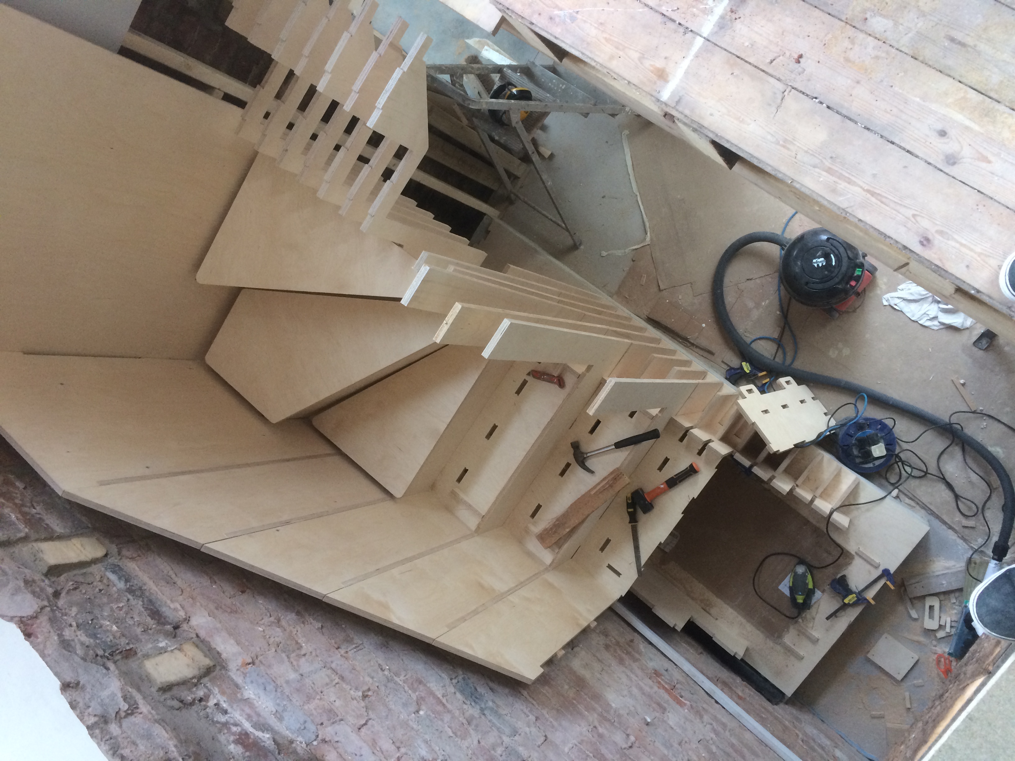 The staircase was constructed on site, using a CNC-milling machine that we hand-built in the workshop. This allowed us to keep costs down but also turn the staircase into a centerpiece, a marriage of hand-making with digital precision.